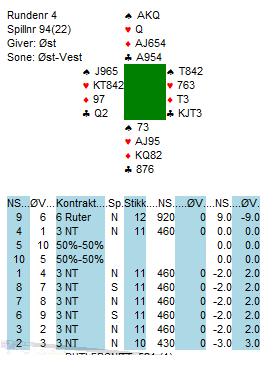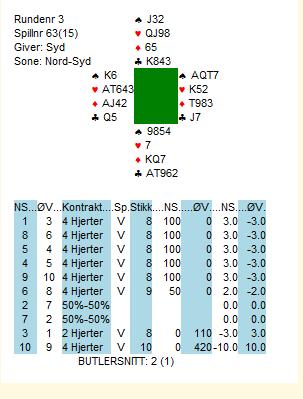 Det kan vel være rimlig å anta at meldingsforløpet ved de andre bordene kanskje kan ha gått; 1hj-1sp-2ru-osv til 4hj. Da blir det ganske store odds for kløver ut og 4hj er alltid to beit. Systemseier for de gode herre Oddbjørn Johansen og Sindre Rovde, og -10 på butlern for Petter Haram.