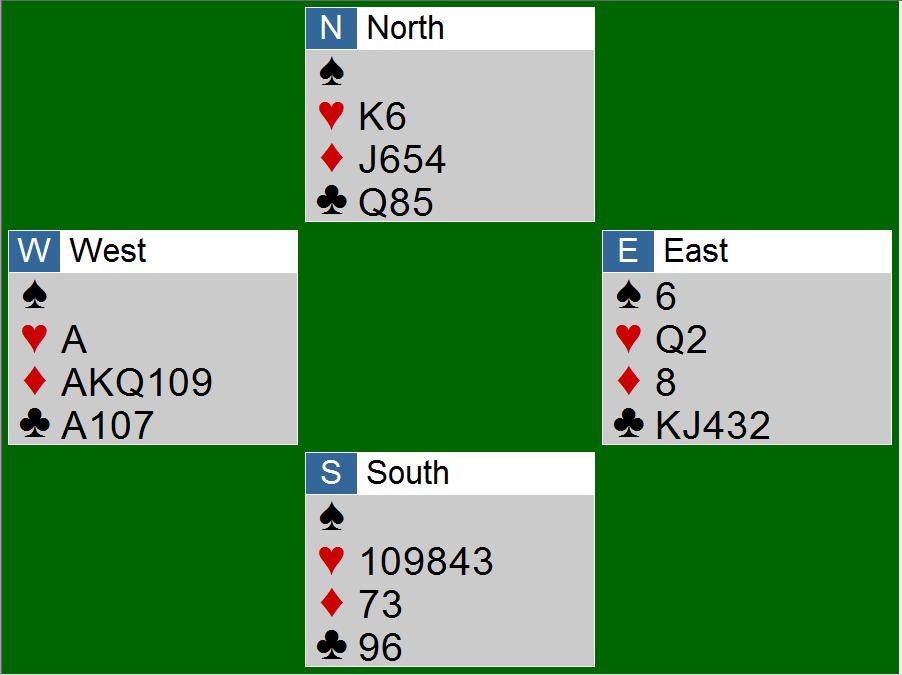 Utspillet var spar 10 og på 4 ganger spar har ingen de helt store problemer, men på fortsettelsen blir det krise for Nord. På tre ganger ruter og stjeling av den 4 og hjerter hjem var Nord ferdig. I digrammet ser en også at i 7NT så hadde det holdt og spilt spar 6. Da kan også Nord bare pakke sammen.