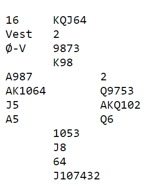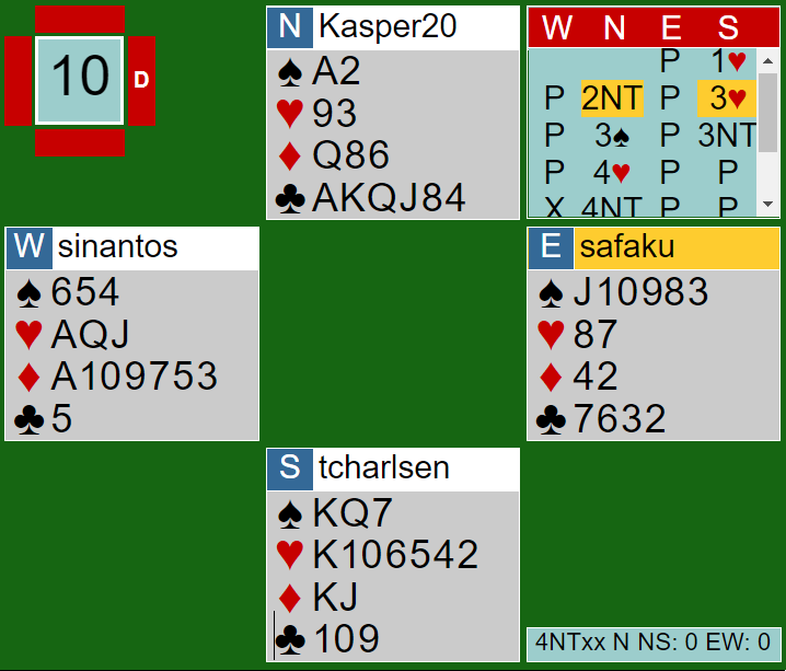 En rask analyse tilsier at det er fare for en taper i hjerter, to i ruter og kanskje en i trumf. Siden det mangler kun 15HP er øst som doblet opplysende i faresonen favoritt til å ha det meste, men ikke nødvendigvis alt av honnører.