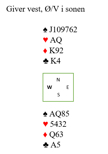 Men om spar konge sitter i saks er jo utgangen bombesikker. Så la oss si du spiller spar knekt i andre stikk og lar den seile. Finessen viser seg å gå bra siden vest følger med liten spar. Da spilles for overstikk som ofte kan være gullkantet i slike spill i parturnering.
