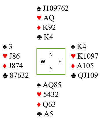Nord havner i 4 spar etter at øst har doblet opplysende over nords åpning 1 spar. Fra øst kommer kløver dame i utspill.