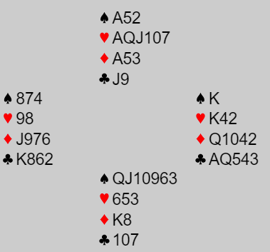 Som du ser, 6 hjerter står normalt lett og selv med ev. 4-0 imot er det godt håp om å etablere 12 stikk. Ta hj A først og en Jxxx blir da avslørt og kan fiskes opp. VI klarte bare å komme i 5 hjerter og det ga oss bare 8-18 i score mens 6 hj med 12 ga hele 23-3, det var altså 4 par av 14 med i spillet som kom i 6 hjerter.