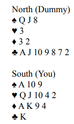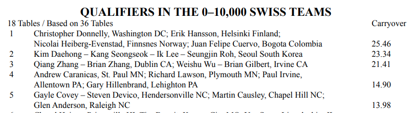 I 2. hånd åpnet Hans Petter Stavrum(V) med 1 ruter (4+) og makker Tom Gyllensten (Ø) svarte korrekt 1 spar. Med 4-4 meldes laveste på 1- trinnet men med 5-5 høyeste. Det er en viktig regel. Pass påny fra Syd mens Stavrum gjenmeldte 2 NT som da viste 18-19 hp. Det fikk Tom til å koble inn turboen i meldeboksen, han gikk rett i 4 NT, 4 ess Blackwood, og da Hans Petter kunne bidra med 2 ess og ut over det måtte ha 10-11 hp til tro like godt Tom til direkte med 7 hjerter. Så fikk Stavrum velge hvilken majorfarge som det skulle spilles i. Og med pass var kontrakten 7 hjerter på Gyllensten sin hånd. Det var lett match for Tom etter kl D ut men godt at Nord og Syd ikke hadde byttet hender for da ville jo sp J ut vært skjebnesvangert utspill. Sparen var jo 5-0 imot. Standard ellers var bare 6 hjerter. Vi fikk -1 for å ha meldt 6 hjerter nå rett føre kunne Arne Marthinussen som spilte med Egil Meyer fortelle da jeg kom sent for å se siste runde.