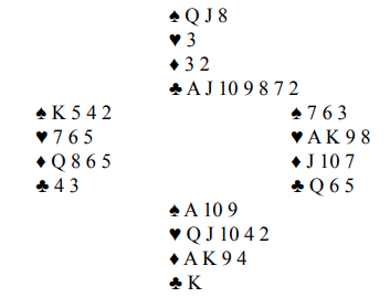 Gorm Norstad (N) og Roar Johansen (S) var motstandere. Arne (Ø) passet selv om 2 spar, Tartan med 2- farge hånd kunne vært OK alternativ. Men vi skal da helst ha 5-5 i fargelengder. Etter pass åpnet Roar med 1 ruter, jeg passet og Gorm fortsatte med 1 hjerter som er minst rundekrav. Nå kom Arne innpå med 1 spar og Roar viste god hånd med hopp til 3 ruter. Jeg var «dum nok» til å meldte 3 spar, håp var jo der å bli doblet med mulige -3 og 500 ut, men det var mindre aktuelt, for Norstad gikk rett i 4 NT (5-ess BW med ruter som trumf) og da Johansen kunne svare med 5 spar (2 ess, ru K= 5. ess, samt ru D) var de alt for høyt siden to ess manglet. Men etter betenkning valgte Gord å avslutte med 6 ruter med sin single 7- er som støtte til makker.