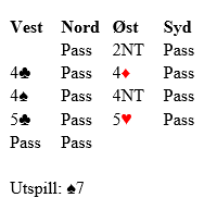Det var noen som fikk kun ti stikk også, både to bet i 6 hjerter og det ble notert både ti og elleve stikk i 4 hjerter. At åtte par fikk ti stikk i utgang skjedde antagelig etter singelton spar ut fra syd. Fra nord er det naturlig med ruter ut, og fra syd spar ut både mot 4 og 5 hjerter. Mot slem er ikke singeltonutspill lurt når man har ett ess selv, for makkeren har neppe spar ess siden syd har kløver ess! Men om Ø/V stopper i 5 hjerter har normalt N/S to nøkkelkort, og nord kan godt ha spar ess i stedet for hjerter konge, eller trumfesset i stedet for kongen. I så fall betes 5 hjerter med spar ut som er et bra forsøk selv om det normalt fører til tretten stikk i dette tilfellet.