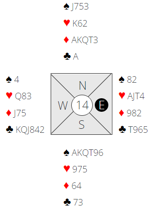 Idet vest inviterer til slem har øst fine kort til å akseptere sleminvitten, og det gjør hun med 4 ruter, eller man kan si 4NT Key Card direkte med helt perfekte kort for hjerterslem. Ø/V får undersøkt slemmulighetene.
