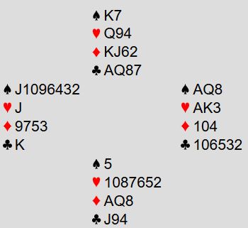 Ivar Berg (Heimdal) valgte mellomløsningen 2 spar. Da gikk makkeren Markus Lind direkte i 4 spar som ble kontrakten. Slik så hele spillet ut: