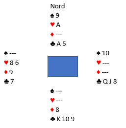 Etter nok en ruter fra vest til knekten ble spar ess innkassert fulgt av to ruterstikk til. Så over på bordet og spar konge-dame, første sjanse var Kn-10-x i spar som ville gjort at spar 9 stod , men slik satt det ikke. Øst likte seg imidlertid ikke for han hadde sparholdet og var også alene om kløverholdet. Nå ble de to siste hjerterstikkene tatt, og før den siste hjerteren så det slik ut: