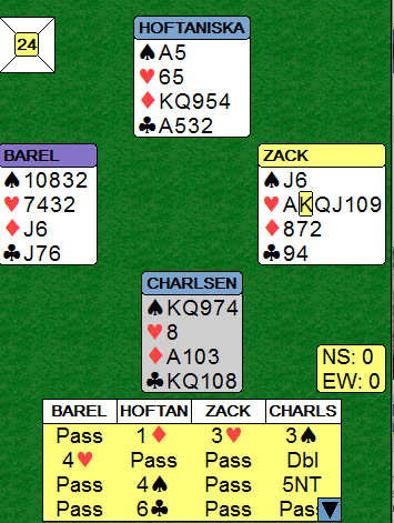 I lukket rom åpnet Geir Helgemo med 1 ruter (ikke krav, men sjeldent å få pass rundt?), Fredrik Steffen Sinonsen gikk innpå med 1 spar og Tor Helness doblet negativt (=4+ hjerter). Erik Berg i Syd sperremeldte 4 spar, men Geir var ikke til å stoppe, 5 spar var Exclution Blackwood (Hjerter avtalt trumf, spør etter ess utenom spar), dobling fra Nord (= farge- styrke?) og redobling fra Øst (Ropi= 0 ess!) og deretter fikk Helgemo tilslag i 6 hjerter. Han vet jo at hj K mangler. Nord- Syd kunne stampet men Berg anså kanskje at det kunne bli bet? Lilleslemmen sto, men taper i hjerter kunne ikke unngås.