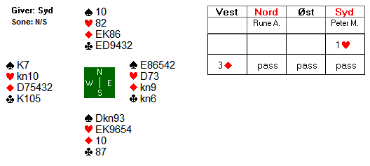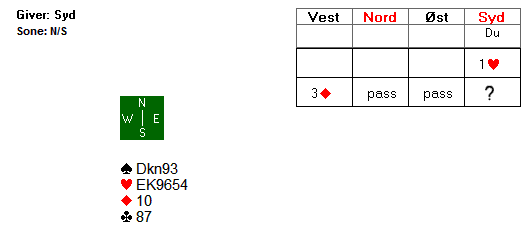 Jens H åpnet med 1 hjerter og Jan Steinar Mydland svarte 1 spar. Nord (skribenten) gikk innpå med 2 kløver. Jens H gjenmeldte 2 ruter og etter pass fra Jahnsen hoppet Jan Steinar til 4 hjerter. Jeg var med, men over 5 kløver satset Ø optimalt ved å melde 6 hjerter.