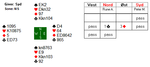 May Liss og Knut var aktivt med mot Arild som viste sterke kort med lang kløver og det endte med 5 øst kløver av Syd og med kl K bak esset var en bet uunngåelig og et bittert -9 mp å bokføre. Jørn og Gunnar fikk tilslaget i 3 ruter (Vest) men 6 tapere ga -100 og Sverre- Torgeir fikk dermed -4. Der Egil og Jørn spilte ble det et helt annet utfall. Egil (Syd) åpnet med 1 kløver, Roar gikk innpå med 1 ruter og etter to ganger pass doblet selvsagt Egil (Jørn kan jo sitte med god ruter og verdier til å bete innmeldingen) men Jørn (Nord) meldte 1 spar. Da Roar gjentok rutermeldingen ville selvsagt ikke Egil gi opp og det endte med 2 spar av Nord på 4-3 tilpasning!