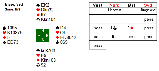 Jeg (N) åpnet med 1 ruter, Tormod gikk innpå med 2 kløver og Jahnsen meldte 2 hjerter (lover jo 10+ hp men Jon liker ikke å passe for ofte). Etter pass fra Eva i Vest hoppet jeg like godt til 4 hjerter og rødt doblingskort kom på fra Tormod. Det gikk deretter pass rundt og Jon kunne ikke unngå å gå 1 bet. Trumfene måtte brukes til stjelinger og Eva fikk beten på hj 9 som etter hvert ble for rent ess å regne! Det ble likevel billig stamp for oss, for de fleste spilte delkontrakt i kløver med 10 stikk. Noen fikk 11. +9 til oss!
