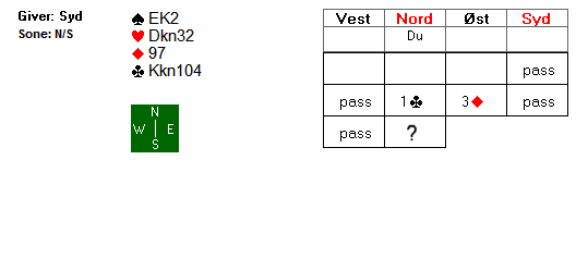 I Sarpsborg BK torsdag var det også ganske jevnt i teten med delt 1. plass. Har ikke spill med vinnerparene, men her ett der Jens H. Gundersen skapte seg en småvrien spilleprøve. Øst og ingen.