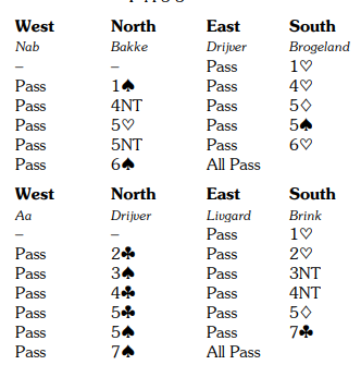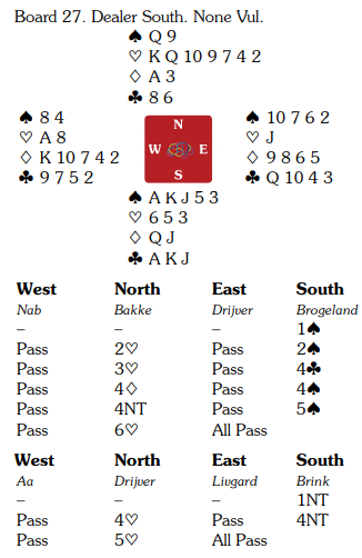 Det er overraskende å se et verdenskjent topp-par som Brink-Drijver melde storeslem med dette. Allan Livgård satt med trumf dame tredje, og da gjelder selvsagt ikke den gamle "regelen" om trumf ut mot storeslem. Drijver tenkte sikkert et øyeblikk på det, hvorfor spilte ikke øst ut trumf?