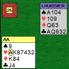 Østs påspill av hjerter dame er fra QJ(x), eller det kan være damen singel. Makker på østs plass har noen verdier i minst en av minorfargene. Hvis det er i ruter kan det hende det må skiftes til den fargen, men det er vel mulig hjerter konge vil ta stikk også? Hvis makker ikke har noe særlig i ruter, men i kløver (og kanskje ett stikk i trumf) bør det fortsettes med hjerter. Aa prøvde hjerter konge, men det var fatalt. Slik så hele spillet ut: