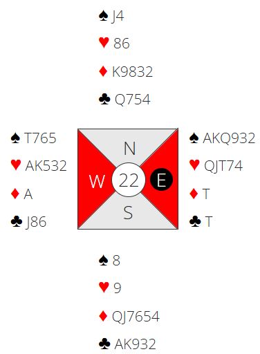 I denne turneringene deltar spillere uten så mye erfaring. Noen kort passer derfor ikke helt til det de har lært med hensyn til antall honnørpoeng (HP) for å melde utgang osv. Det er hvis det er veldig skjev fordeling, lange farger og enorm tilpasning, kanskje i begge retninger. Slikt kommer med mer erfaring, men vær klar over at selv for veldig erfarne spillere kan det være vanskelig å tråkke rett når det er den typen kort. Her er et eksempel på et sånt spill fra denne turneringen: