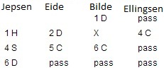 Dette ble veldig jevnt, med 6 par mellom 50-55%. Torstein og Jan Gunnar vant, forran Frode og Erling. På landsbasis kom Torstein og Jan Gunnar på 23.plass, mens Bjørg og Steinar ble nr.27. Landsresultatene finnes her; http://bridge.no/var/ruter/html/9901/2013-04-04.htm .