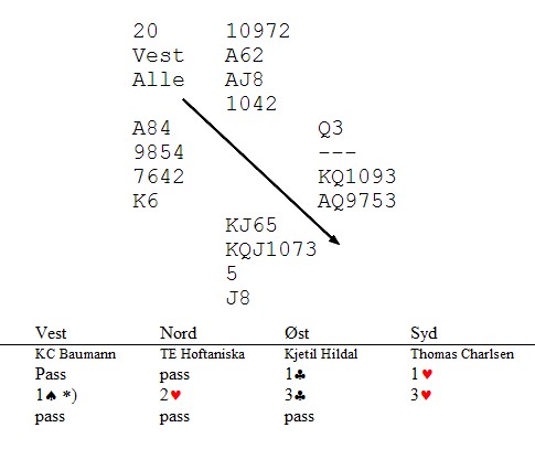 Kjetil Hildal glemte å alertere 1sp, men kom på det et stykke ut i meldingsforløpet. TL ble tilkalt og han bivånet resten av spillet. Alt selvsagt helt ok. Thomas spilte 3hj hjem med ti stikk og ba turneringsleder se på spillet. Da burde (etter min mening) resten av hendelsesforløpet vært slik: