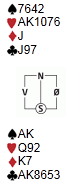 I spillet under var det bare små detaljer fra suksess i en hardmeldt slem. Etter å ha oppvurdert min egen hånd til en 20-poenger, og dermed god nok for NT-intervallet 20-21, fikk jeg trumfhånda på min hånd. Verdiene til meg og makker satt fint sammen, og derfor var ikke 6 hjerter helt håpløst. Vest hadde vært innpå med rutermelding, men istedet for å gi deg en fordel ved å spille ut ruteress spiller han heller ut liten spar som må gå til honnør på hånda. Hvordan planlegger du spillet fra syds hånd?
