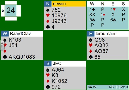Det er ikke hvem som helst som sitter NS. Syd er James Cayne og nord er en italiensk toppspiller. (husker ikke helt hvem). BOA får spar ut til esset og mer spar. Syd er markert med de uteværende honnørene og da ser dette tungt ut? Syd kaster etter bordet og ser ut til å ha kontroll.