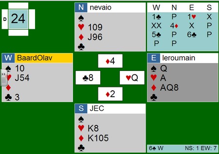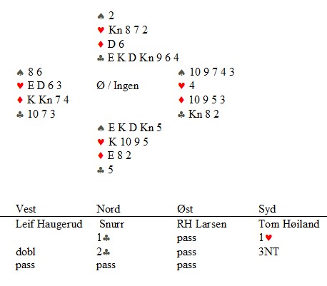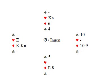Så spar til damen og syd er ferdig. Kaster han en ruter, spiller BOA ruter ess og ruter til stjeling. Bordet står med hjerter ess som inntak. Kaster Syd hjerteren, tar BOA for hjerter ess og feller kongen, ruter ess og kaster den lille hjerteren (nord burde holdt en hjerter mer og en ruter mindre). Ruter til stjeling og hjerterknekt står.