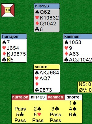 Jan Tore og PIL kom med flotte +650 fra sin kamp, men på det andre bordet meldte Terje Aa inn  2kløver med 6-5. Da kunne de ikke komme i spar lenger og måtte stampe(?) over 5ru i 6kl. Odin straffedoblet, men Petter turde ikke stå med. Han hadde kanskje tro på slem egen vei?