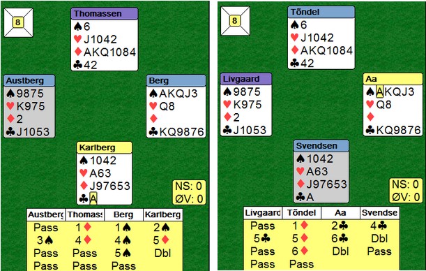 Et svært godt spill på begge bord. 6kl betes vel i praksis med hjerter ut, men på begge bord ble det ruter ut mot 6kl. Odin og Svein Gunnar stakk begge og fant vinnende plan ved å stjele en ruter i stikk to. Tre kløver fra taket ga vunnet slem.