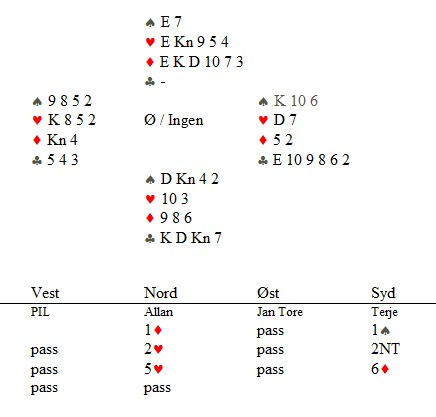 Det som gjerne skjer videre i meldingsforløpet, er at åpneren sitter med et ønske om å fortelle makker at han har en kanonhånd, LANGT sterkere enn makker i sine drømmer kan forestille seg. Jeg skønner godt at Allan i nord ønsket å formidle det og 5hj var i alle fall ingen undermelding. Det presset Terje Aa til å melde slem i ruter, men han hadde sikkert en mistanke om at makker sannsynlivis ikke hadde mye bruk for hans svarte honnører.