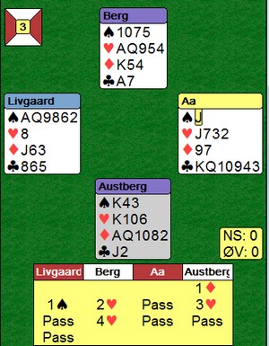 Dette så Berg og spilte en liten spar i stikk tre. Motparten var sjanseløse når Jan Tore spilte en liten også neste gang han rørte farge. På denne måten godtspilte han tre sparstikk tl seg selv uten at motparten fikk mer enn to. Sammen med kløveresset og hjerteresset var det ikke nok til å beite.