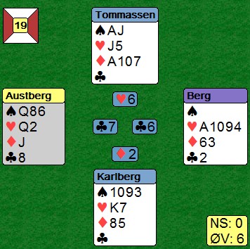 Esset vant og ruter konge fra bordet. Nord stakk, spilte hjerter til makkers dame og mer spar. Den ga Jan Tore også bort og nå så det ut som det mangla et stikk i posisjonen under.