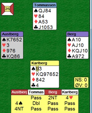 På den siste kløveren gjorde Kurt Ove feil når han kasta hjerter og Svein Gunnar når han kasta ruter. Det var det Jan Tore trengte. Hjerter til esset for å strippe nord (han trodde nok nord hadde blanka hjerter konge). Så ruter og nord måtte gi bordet det siste for spar damen.
