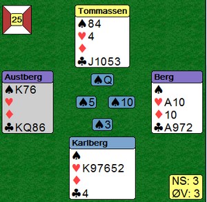 Svein Gunnar startet med ruter til nier, dame og konge. Så kløver til esset og spar til kongen som vant stikket.