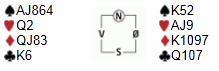 Spillet under spilte jeg med en ukjent makker på nettet, og du kan jo se om du klarer å få det til bedre enn denne. Øst åpner 1 ruter, vest svare 1 spar, øst 1NT før vest avslutter meldeforløpet med 3NT og pass rundt. Motparten har forholdt seg tause. Ut kommer liten kløver, antagelig fra femkort, og denne vinner spillefører med tieren på hånda.
