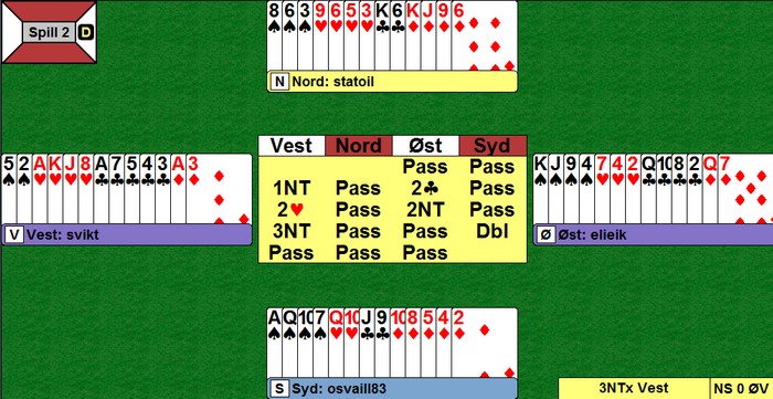 Dette kommuniserte Kåre Bogø med sin dobling av 3NT. Det eneste som var uklart, var hvilken farge som var bordets første meldte farge.