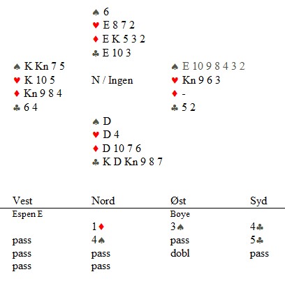 Syd passet også, selvfølgelig, og Vest doblet opplysende ved de fleste bord. Noen Øst-spillere gjorde dette om til straffedobling og tok inn 300.