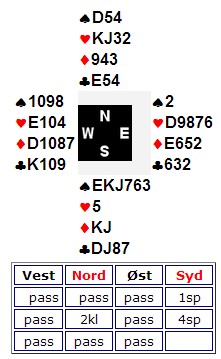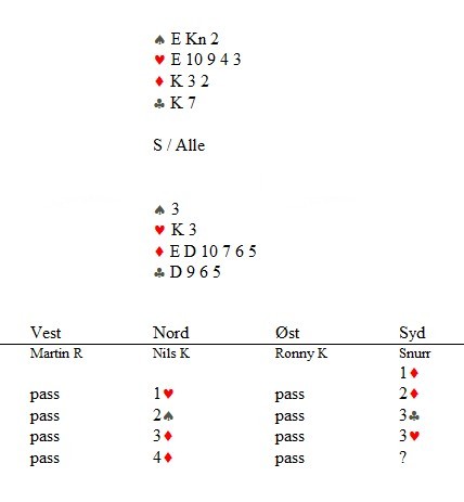 Jan Arild Løvland spilte ut en liten hjerter (!). Kjetil Hildal la selvfølgelig knekten som tapte til damen. Dagfinn Iversen skifta til en liten ruter. Kjetil tenkte vel som jeg at en spiller som allerede har vist ED i hjerter, har neppe ruteress etter å ha passet i tredje hånd. Han brukte knekten og måtte senere tape et kløverstikk. Da ble det bare ni.