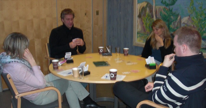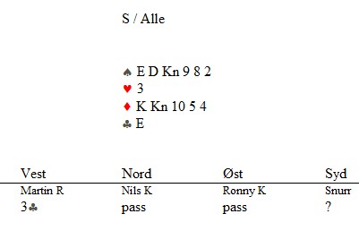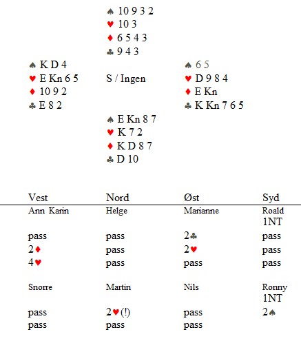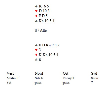 Klarer du denne? Skrevet 15. December, 2013 av Snorre Aalberg Marianne Harding, Snurr, Ann Karin Fuglestad og Nils 200 Kvangraven Noen ganger handler bridge om å "komme på" rett melding. Jeg klarte det ikke i spillet under, men det gjør sikkert du? Ja, hva blir det til? Du trenger faktisk ikke mer enn EDx(x) i ruter hos makker før det står slem (i verste fall på en sparkapp gjennom han som ikke sperreåpnet), men hvordan kan du finne ut av det? 4ru som "Jumping Michaels" bør være mulig å komme på. Det er krav til utgang med ruter og en major. I verste fall kan en komme i 5ru der en skulle vært i 4sp, men oppsiden er mye større. Under ser du Nils sin hånd og for han er det nå snakk om seks eller syv med de honnørene han har. Martin Reinertsen, Nils Kvangraven og sørlandets største talent, Ronny Kolnes. Add comment