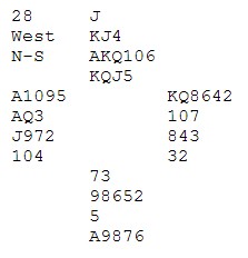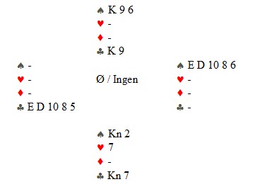 Svein Gunnar spiller ut ess, konge og dame i spar. Jeg stjeler spar dame, for så å legge ned ruter konge, fulgt av ruter til ess og ruter til stjeling. Om man ikke stjeler spar dame, vil det være vanskeligere å finne den aktuelle ruterstjelinga.