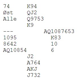 hvor vi var i 4 spar, og fikk ruter ut til esset. Mot oss skiftet han til hjerter, og vi gikk ei beit. Over halve salen hadde fått 11 stikk. Vi kunne selvsagt stoppet i 3 spar, men det hadde gitt 14 MP.