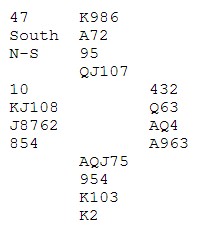 I neste spill (48) var vi ett av få par som ble doblet i 3 NT. Svein valgte å spille på ruter konge foran, og da ble det 2 beit (ei beit hadde gitt 7 poeng). totalt 1 poeng på en runde med helt normale kontrakter.