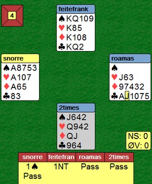 Så kommer slike spill som det til venstre. Kløver knekt ut til damen. Så spar konge og motparten tar to beit med fire kløverstikk og tre ess.