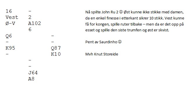 Nord-Trøndelag har variert mellom å vinne eliteserien i bridge det ene året og rykke ned det neste. I år er de i Championship, men ledelse og klar plan om å rykke opp. Knut Storeide sender meg et spill med John Saur i hovedrollen. Dere andre i samme pulja bør sjælve i buksa!!