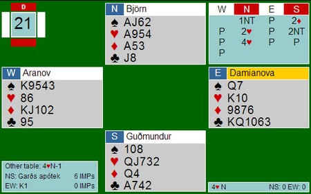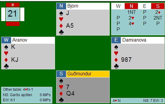 I spillet under vant Geir Helgemo 12 IMP i sin kamp. Jeg må innrømme at jeg ikke ville vært i nærheten av de IMP'ene om jeg hadde sittet på Geir sin plass. Hva med deg?