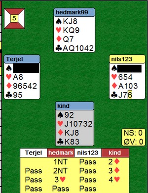 Syd åpner etter to passer med 1hj, femkort, og vest melder inn 1NT og det gikk pass rundt. Noen ville sikkert overført til spar, men på tre bord havnet vest i NT.