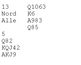 Makker Håkon Bogen spilte ut spar to til esset og spar til stjeling. Så ruterkongen fra bordet. Nå tenkte jeg slik at Allan ville spille ruteren fra bordet slik at jeg ikke kunne se hvor mange syd hadde og derfor lasjere feilaktig. Han kunne godt ha singel, så jeg turde ikke annet enn å stikke med esset. Makker la syveren og jeg så at det var feil å stikke. Nå hadde Allan et inntak på ruter 10 og kunne bruke den som overgang til enda en sparstjeling.