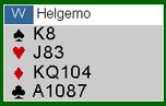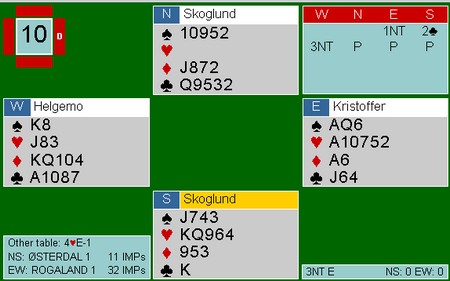 men det hjalp ikke mot Geir Helgemo. Til venstre ser du hvorfor. Vest dekket selvsagt ikke, men tieren seilte rundt. Hadde øst vært utstyrt med DJ blokk og vest 964 opprinnelig, ville dette vært et prisspill for ØV.