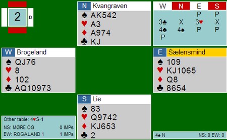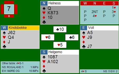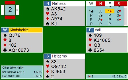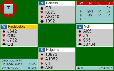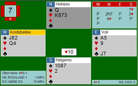 I det andre rommet var det hjerteren 5-1 som gjorde at 4sp sto. Her var det hjerteren 5-1 som gjorde at utgangen til Helness - Helgemo IKKE sto. Det var ikke mulig å komme unna tre hjertertapere sammen med kløveresset.
