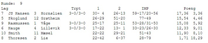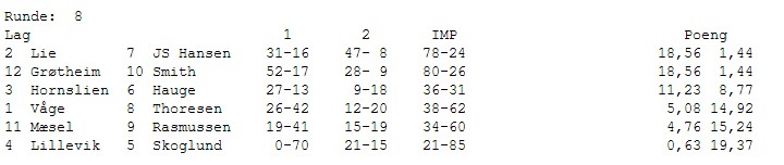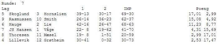 Etter to klare tap var JS Hansen (Kristiansand) nesten i nedrykksposisjon, men 17,36 mot Hornslien senket skuldrene der i gården. Lie tar inn enda 6 VP på Hauge og vi lurer på om de virkelig skal ta igjen den klare ledelsen. Mæsel lever farlig og burde slått en mer eller mindre fortapt Smith for å være på trygg grunn. Det brenner også et blått lys for Våge. Skoglund tar sin tredje sterke seier, denne gangen mot Grøtheim.