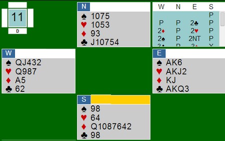 Dette spillet skriver Nils Kvangraven om på sin side der Bjørn Bentsen vinner 6ru etter spar ess og mer spar i utspill. Han røffer med kongen og kapper ruter på tieren. Så litt fram og tilbake for to hjerterkapper og tolv stikk.
