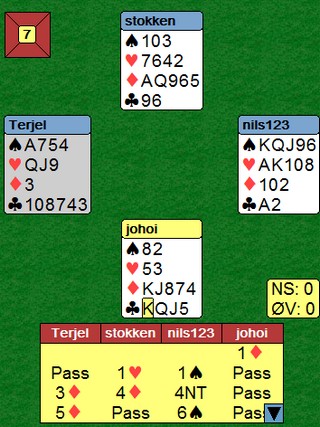 Faktisk ikke. Øst som går på mot slem når makker viser singel ruter, har 100% sikkert en god sidefarge i hjerter. En eventuell finesse i hjerter ser du vil gå greit. Trumfen er helt sikkert tett og øst har kløveresset.